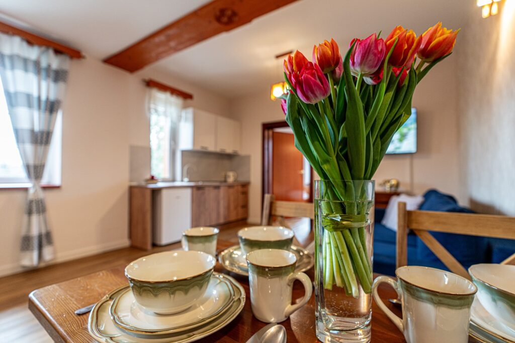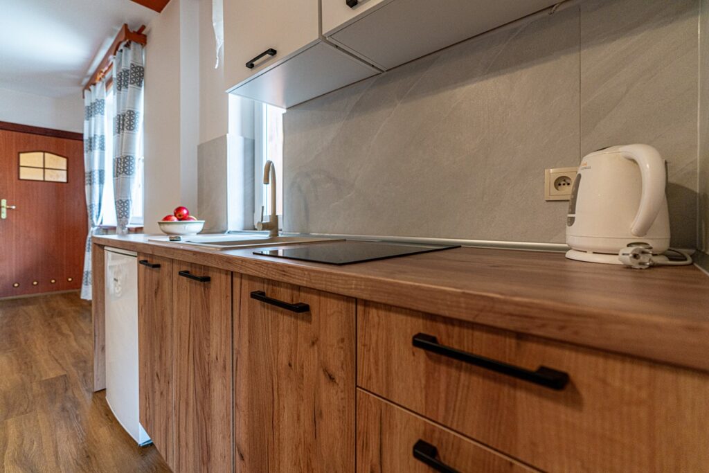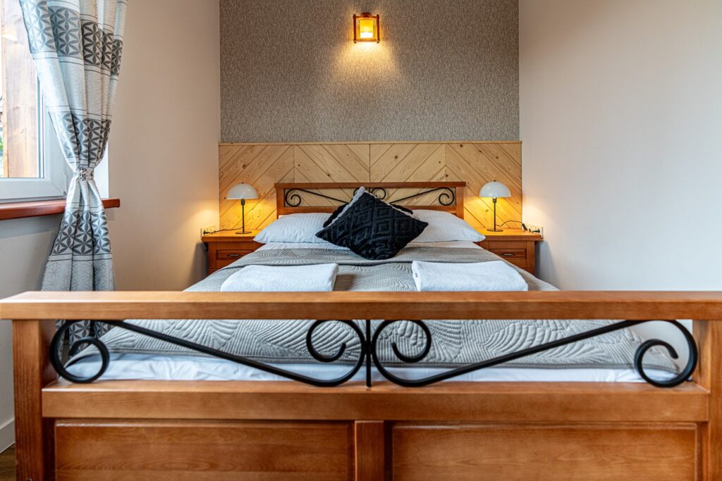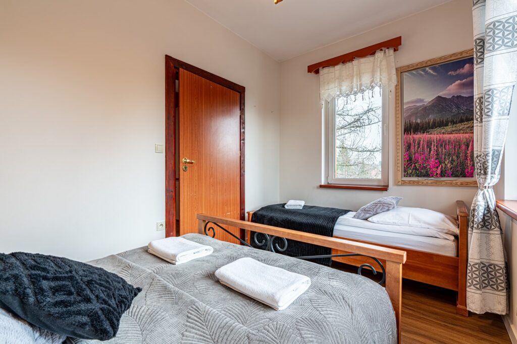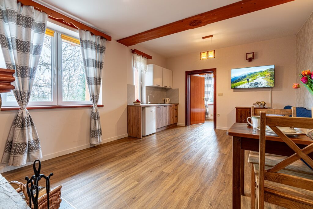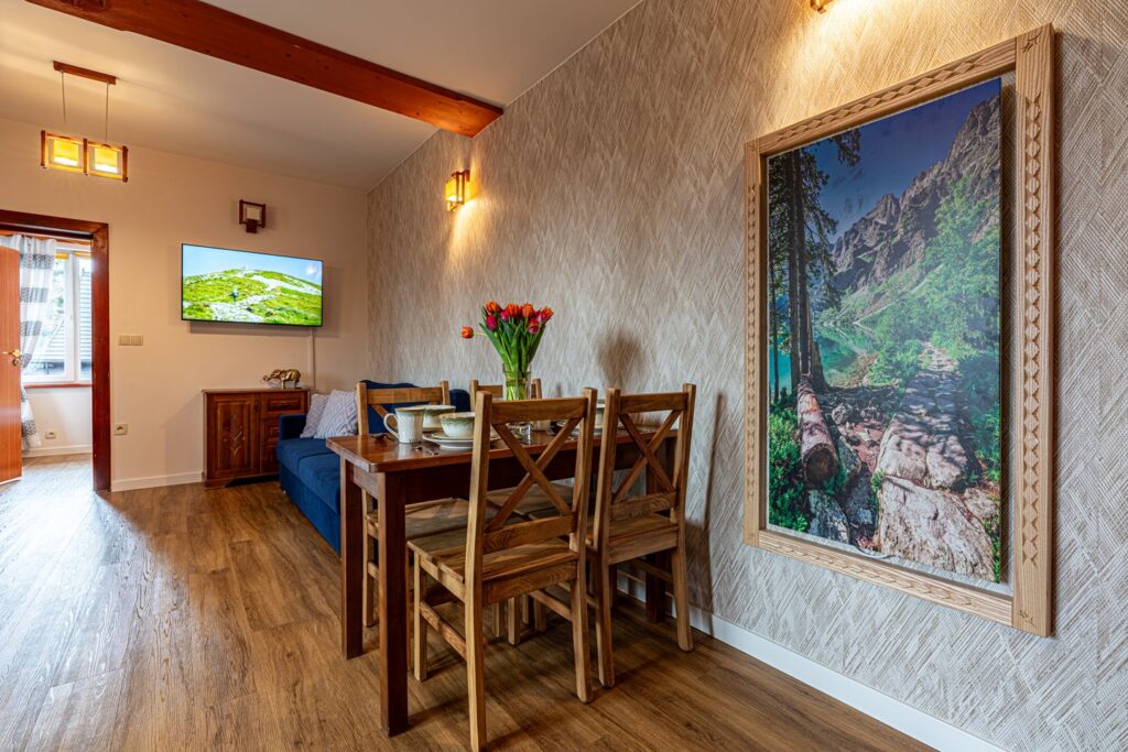 Przestronny, 5-osobowy apartament, z widokiem na Giewont. W strefie dziennej znajduje się: aneks kuchenny, z kompletnym wyposażeniem (płyta grzewcza, lodówka, naczynia, garnki, sztućce oraz czajnik elektryczny), stół i 4 krzesła, rozkładana sofa dwuosobowa, TV z płaskim ekranem, a także kominek opalany drewnem. W sypialni wygodne łóżko małżeńskie i dodatkowe łóżko pojedyncze. W łazience prysznic i mięciutkie ręczniki.