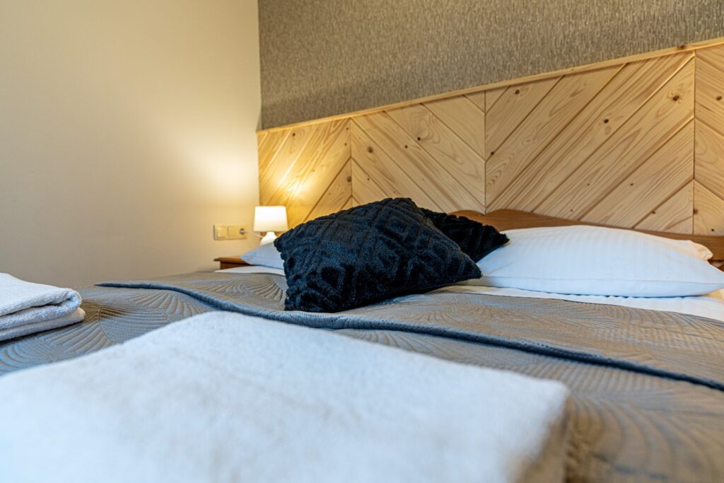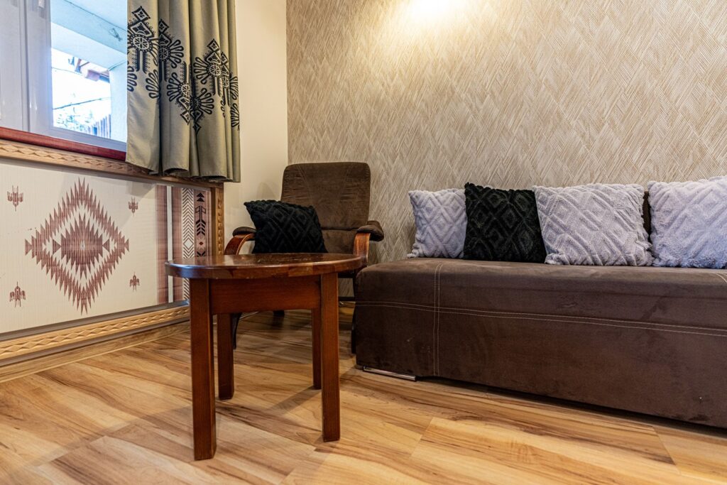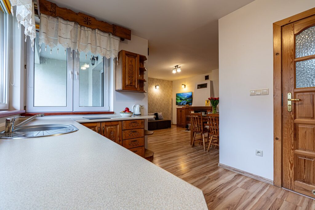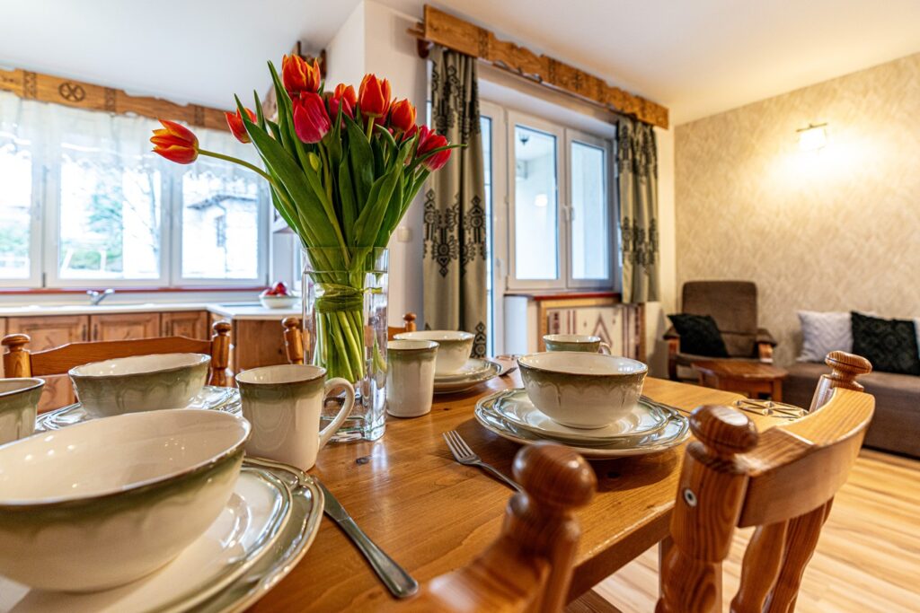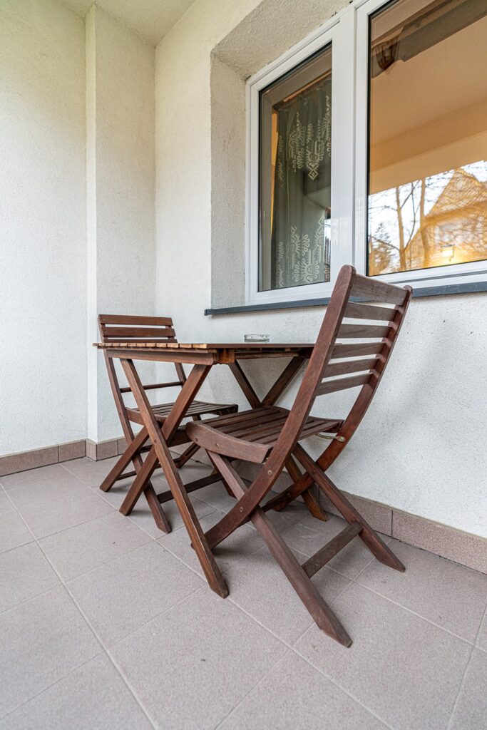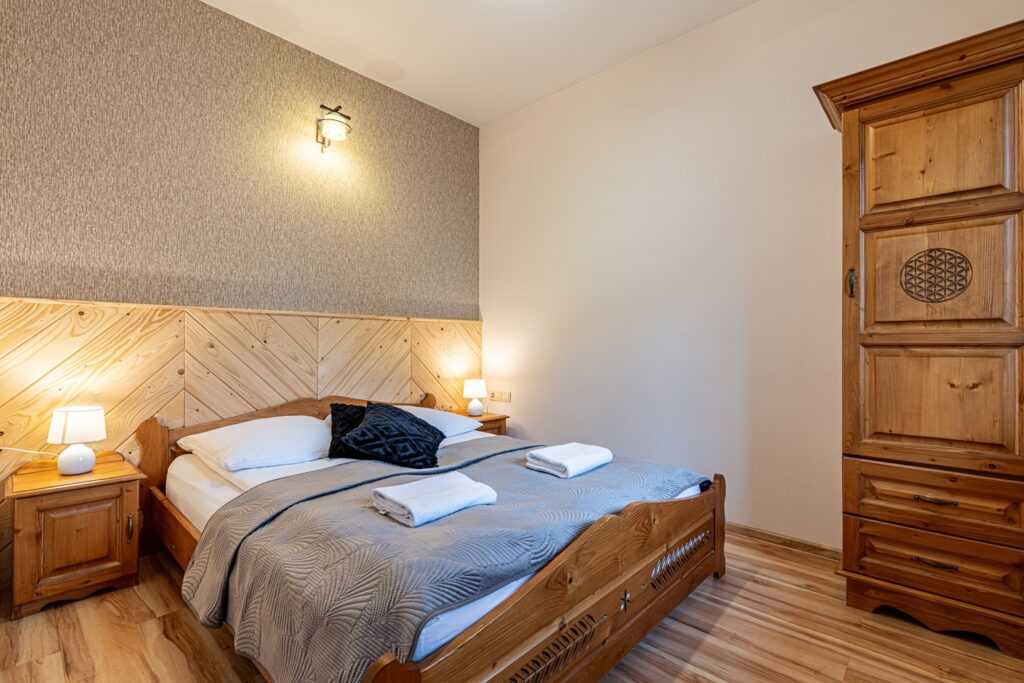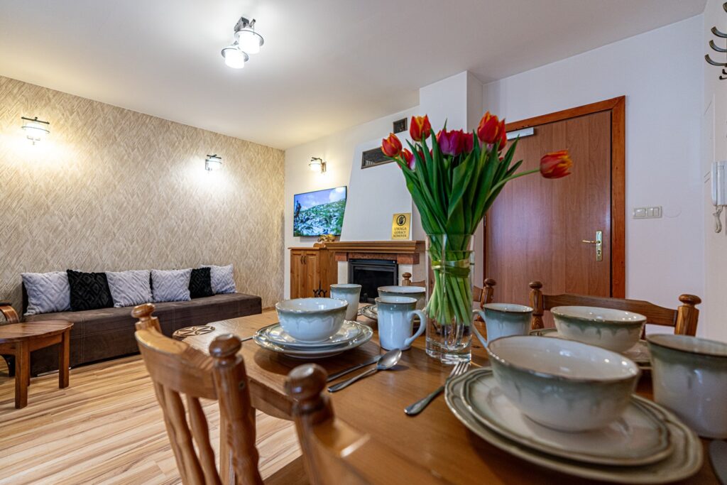 Komfortowy, 4-osobowy apartament. W strefie dziennej znajduje się: wyposażony aneks kuchenny (płyta grzewcza, lodówka, naczynia, garnki, sztućce oraz czajnik elektryczny), stół i 4 krzesła, rozkładana sofa dwuosobowa, TV z płaskim ekranem, a także balkon i kominek opalany drewnem. Sypialnia, z łóżkiem małżeńskim, a łazienka z prysznicem i mięciutkimi ręcznikami.