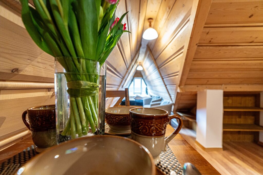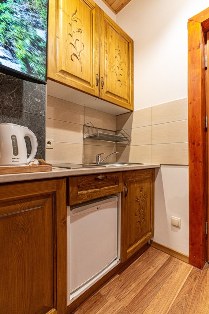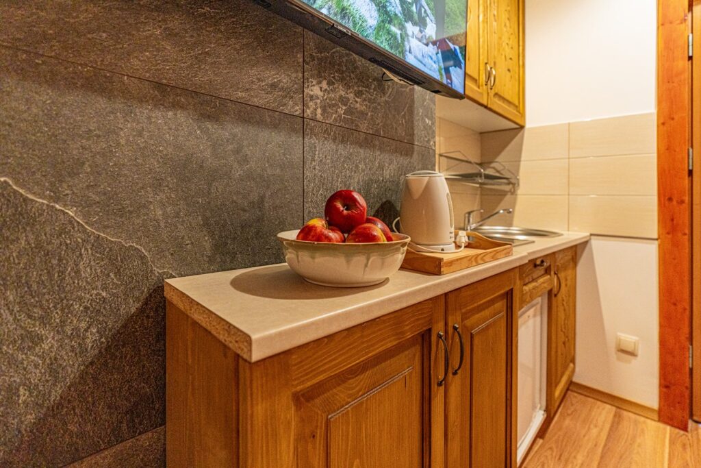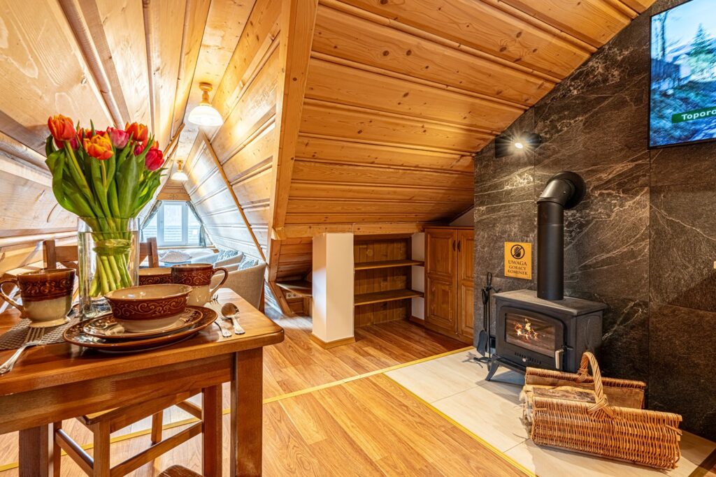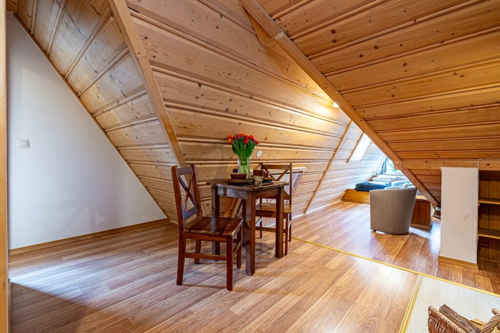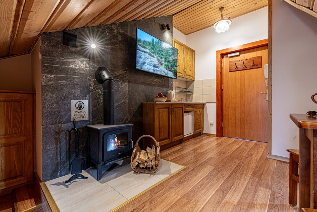 Klimatyczny apartament typu studio, z łazienką. Znajdziesz w nim: wyposażony aneks kuchenny (lodówka, płyta grzewcza, garnki, naczynia, sztućce oraz czajnik elektryczny), stół i dwa krzesła, TV z płaskim ekranem oraz kominek opalany drewnem. W sypialni wygodne łóżko małżeńskie. Łazienka, z prysznicem i mięciutkimi ręcznikami.